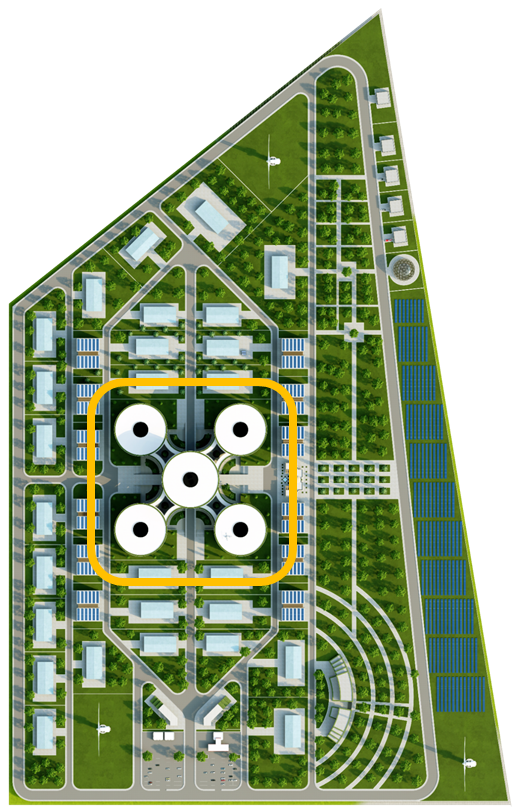 The occupancy area that can be designed for buildings and different sections of the smart industrial city in Damascus is about 70% of the entire land area, and 20% of this percentage is allocated to green spaces and access roads to the site. While the space allocated for buildings and service facilities required in the Industrial City complex is 50% of the total land area and is shown in the plans below.